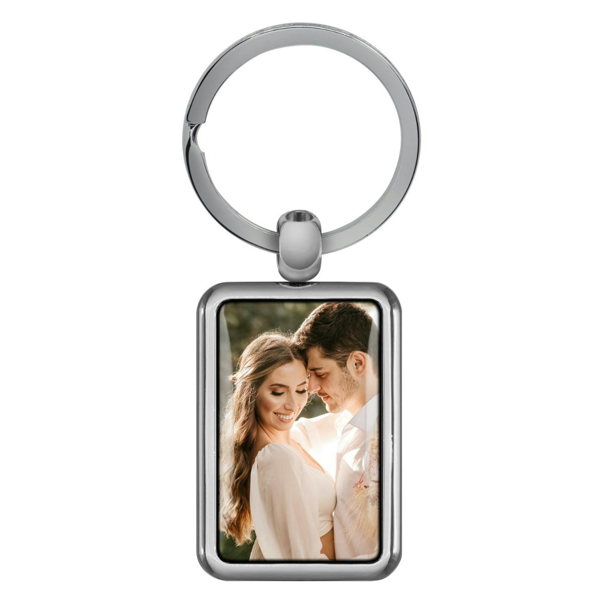 Verchromter Schlüsselanhänger aus Metall mit Foto-Aufdruck unter einer glasklaren hartelastischen Kunststoffschicht. Extrem widerstandsfähiger Oberflächenschutz und Linseneffekt durch Doming-Technologie*.